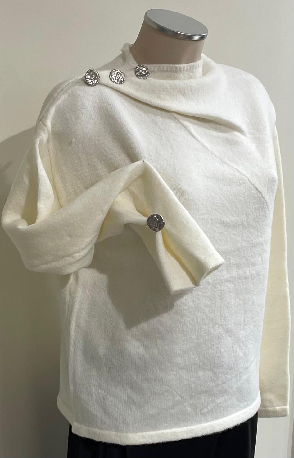 Maglione donna, collo morbido con bottoni gioiello, manica a trombetta con bottone gioiello, tessuto misto, colore panna.