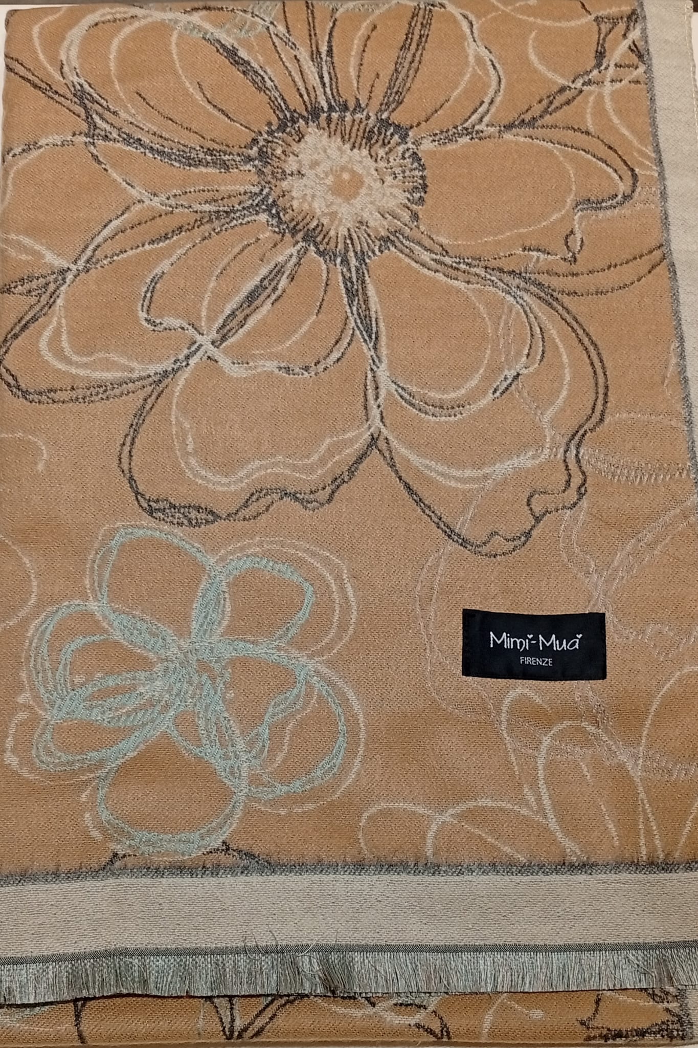 Sciarpone donna, con frangetta, fantasia fiori, tessuto 100% PL, colore: rosa, cammello.
