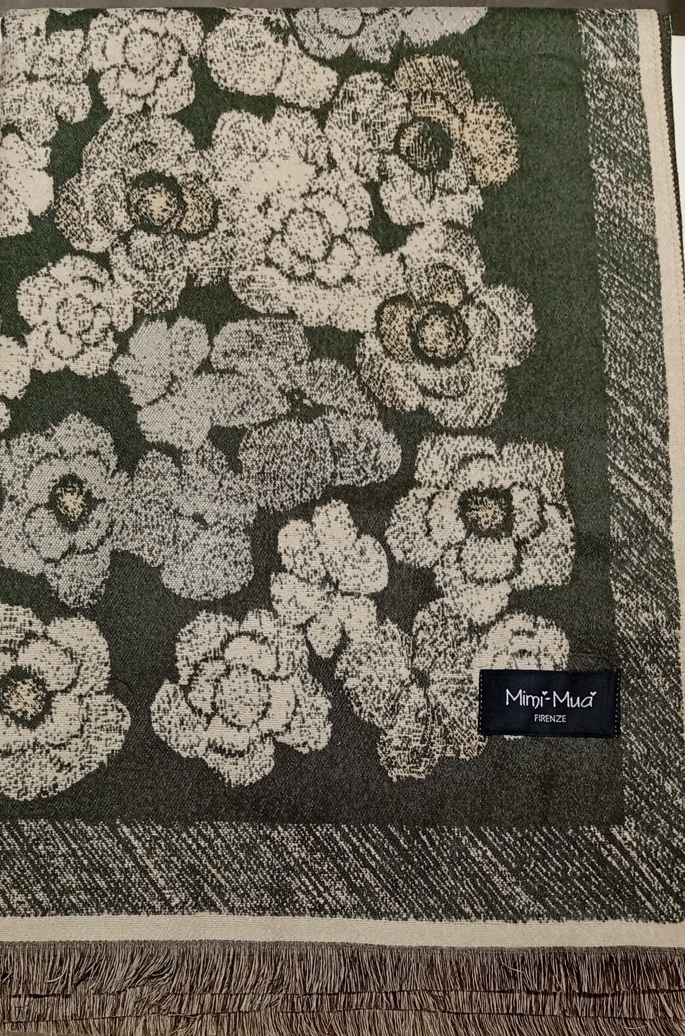Sciarpone donna, con frangetta, fantasia fiori e cornice, tessuto 100% PL, colore: verde militare, nero.
