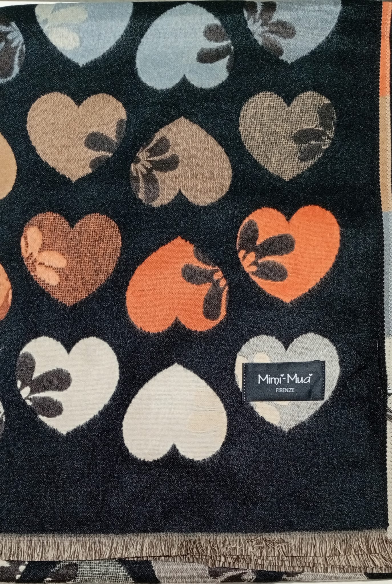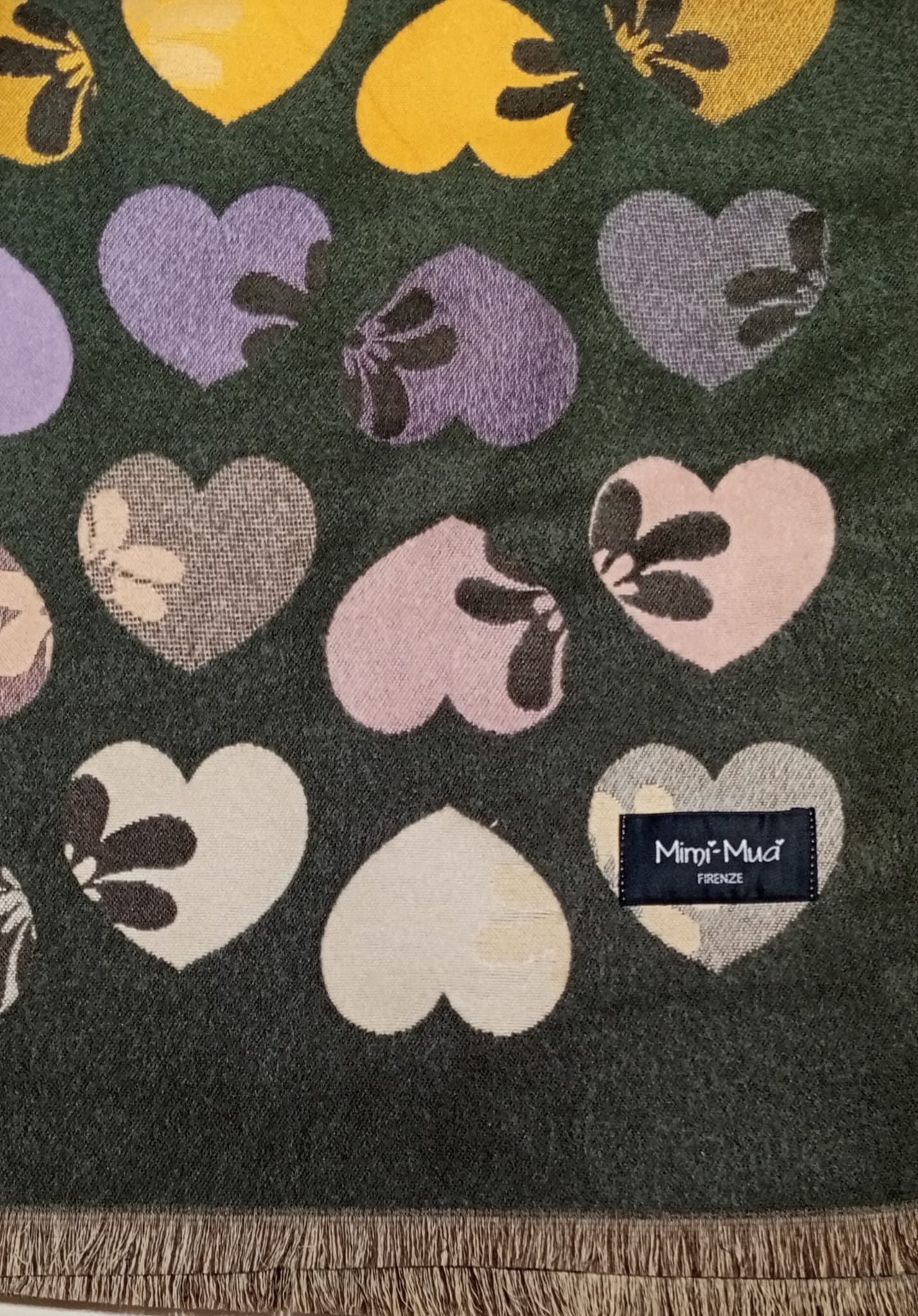 Sciarpone donna, con frangetta, tessuto 100% PL, fantasia cuori, colore: verde militare, moro, nero.