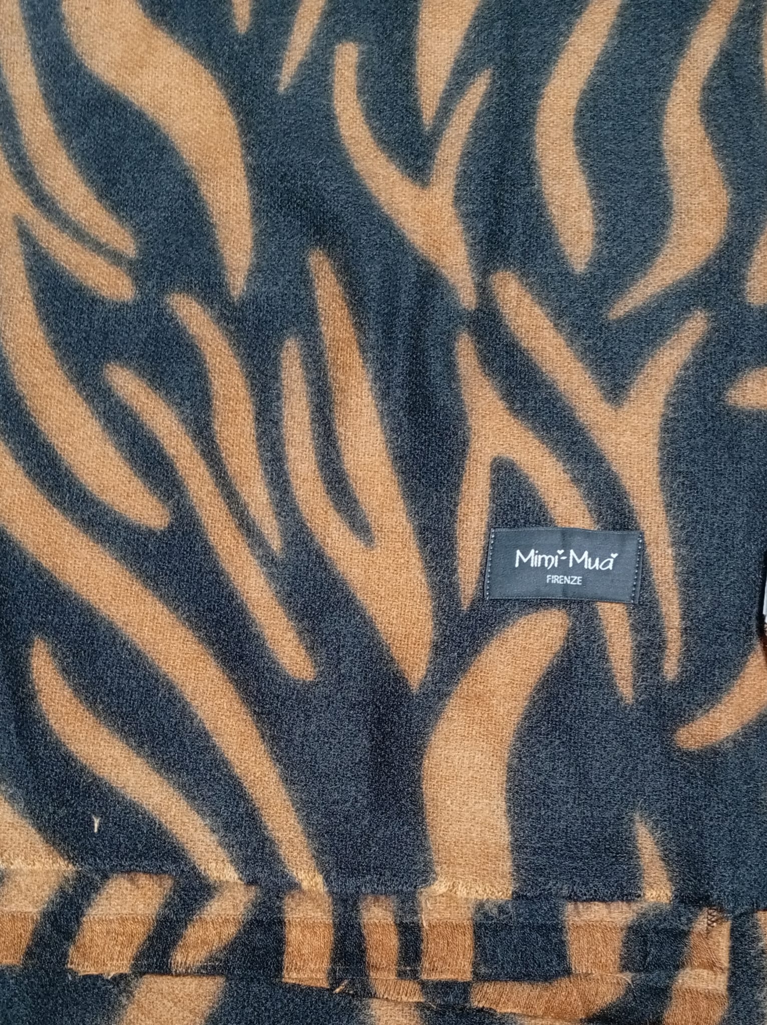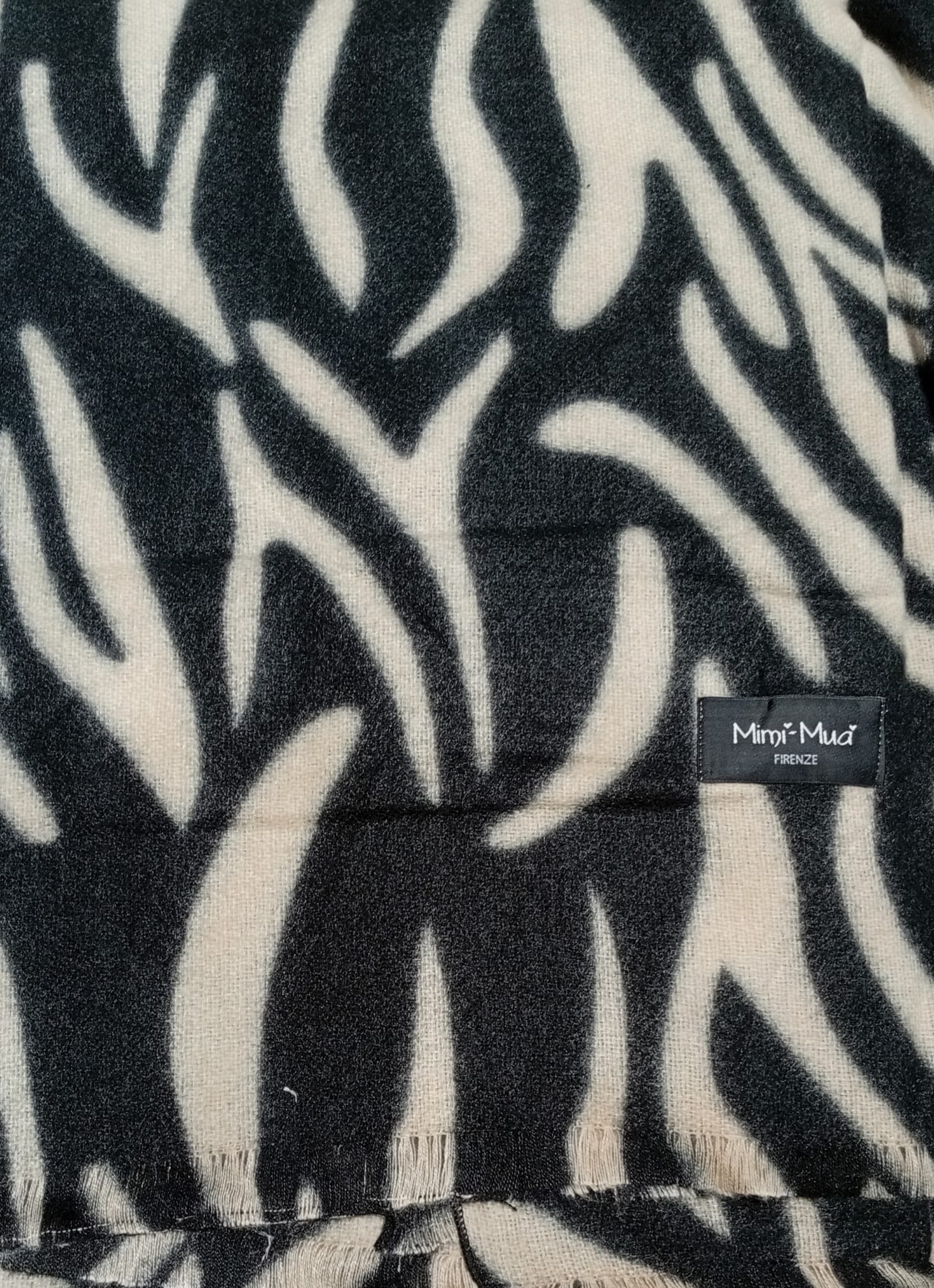 Sciarpone donna, con frangetta, fantasia zebrata, tessuto 100% PL, colore: nero/ cammello, nero/bianco.
