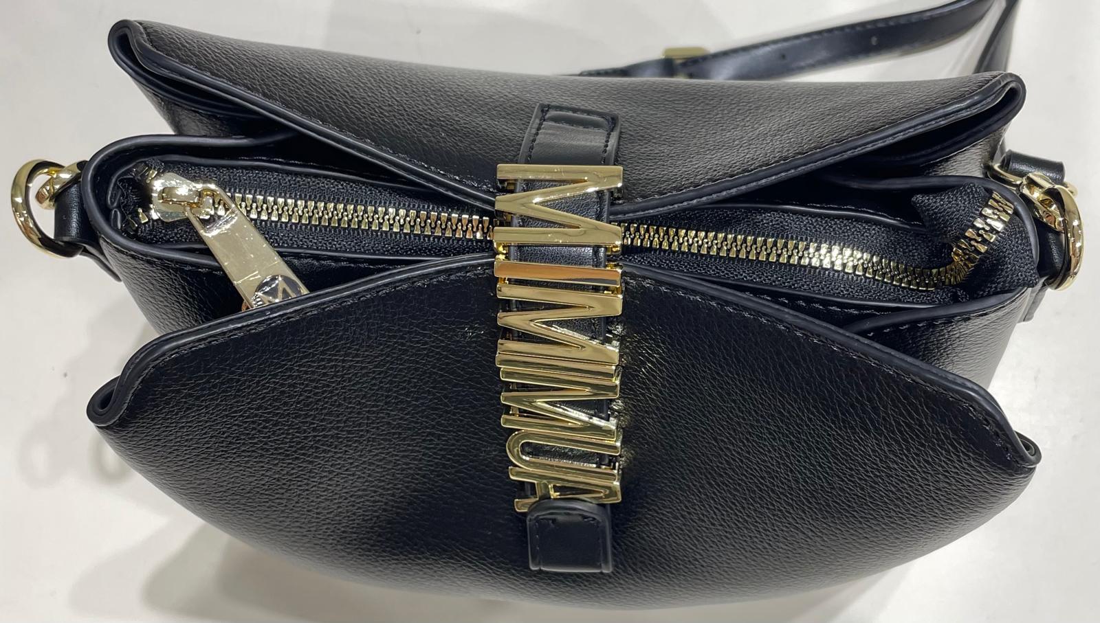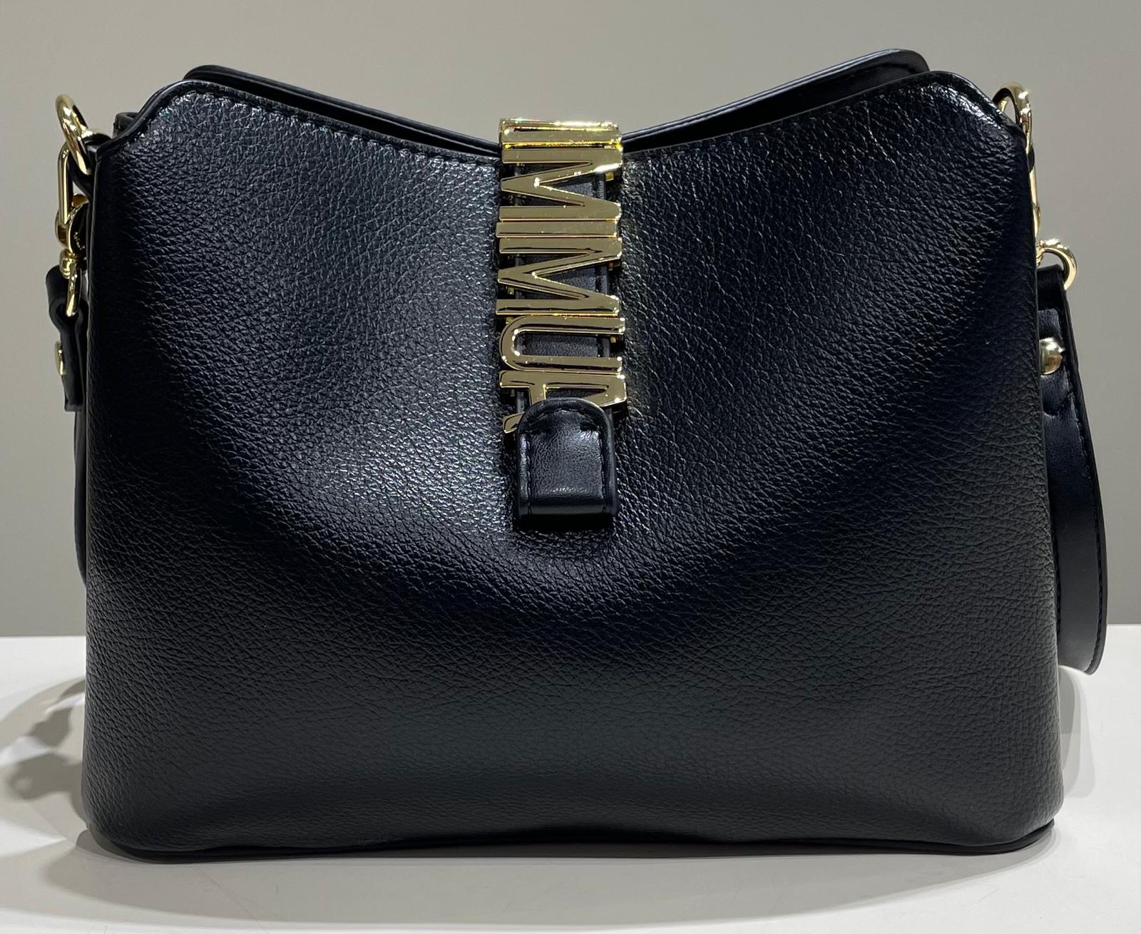 Borsa modello tracolla, con patta lettere logo metallico, ecopelle spazzolato, colore: nero.