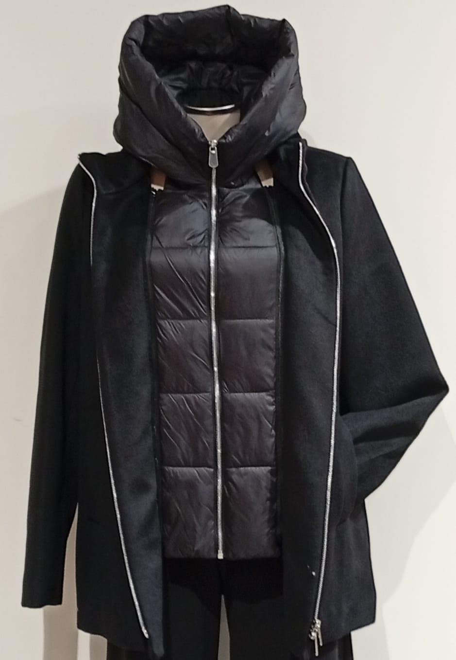 Cappotto corto, con zip, cappuccio e panciotto in piuma staccabili, tinta unita, colore nero.