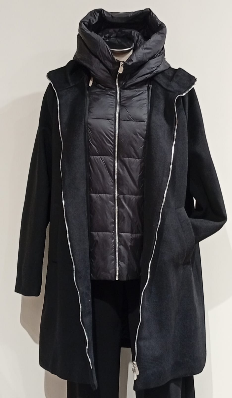 Cappotto 2 pezzi staccabili, con zip, con cappuccio e patta in piumino, tinta unita, colore nero.