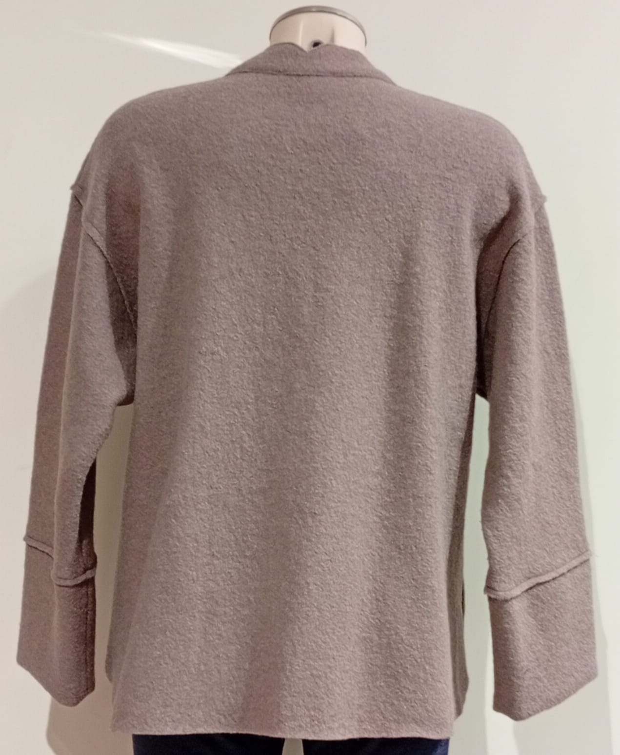 Giacca donna, collo pistagna, chiusura con bottoni, sfoderata, modello curvy, tessuto pura lana, cuciture a vista, bordi taglio vivo, colore tortora.