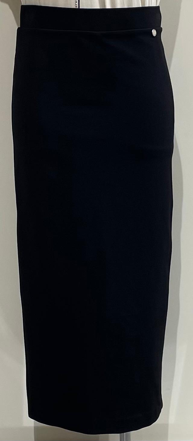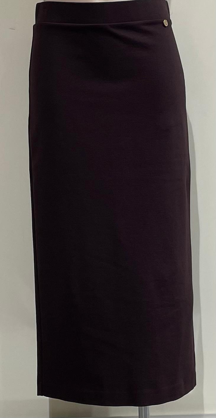 Gonna modello tubino, elastico ricoperto in vita, longuette, ampio spacco sul retro, tessuto punto Milano, tinta unita, colore: nero, cioccolato, bordeaux.