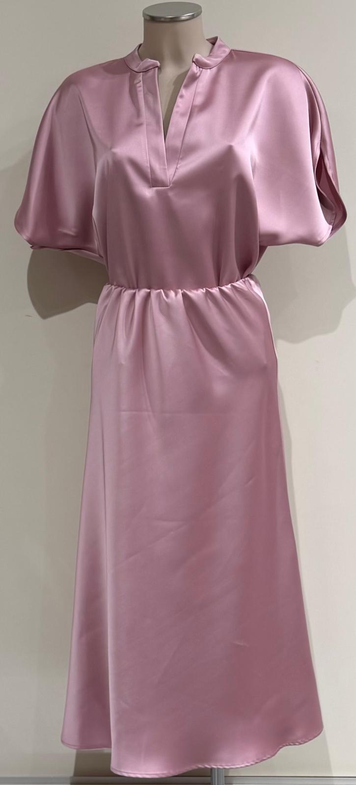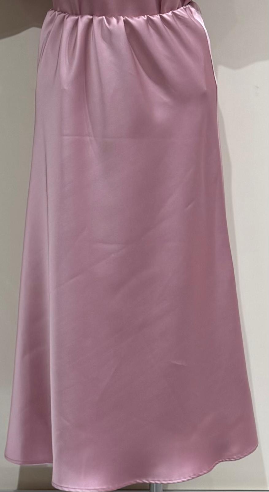 Gonna midi, tessuto raso, tinta unita, elastico in vita, svasata, colore rosa.