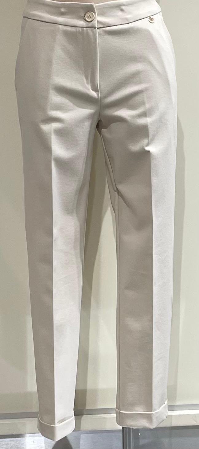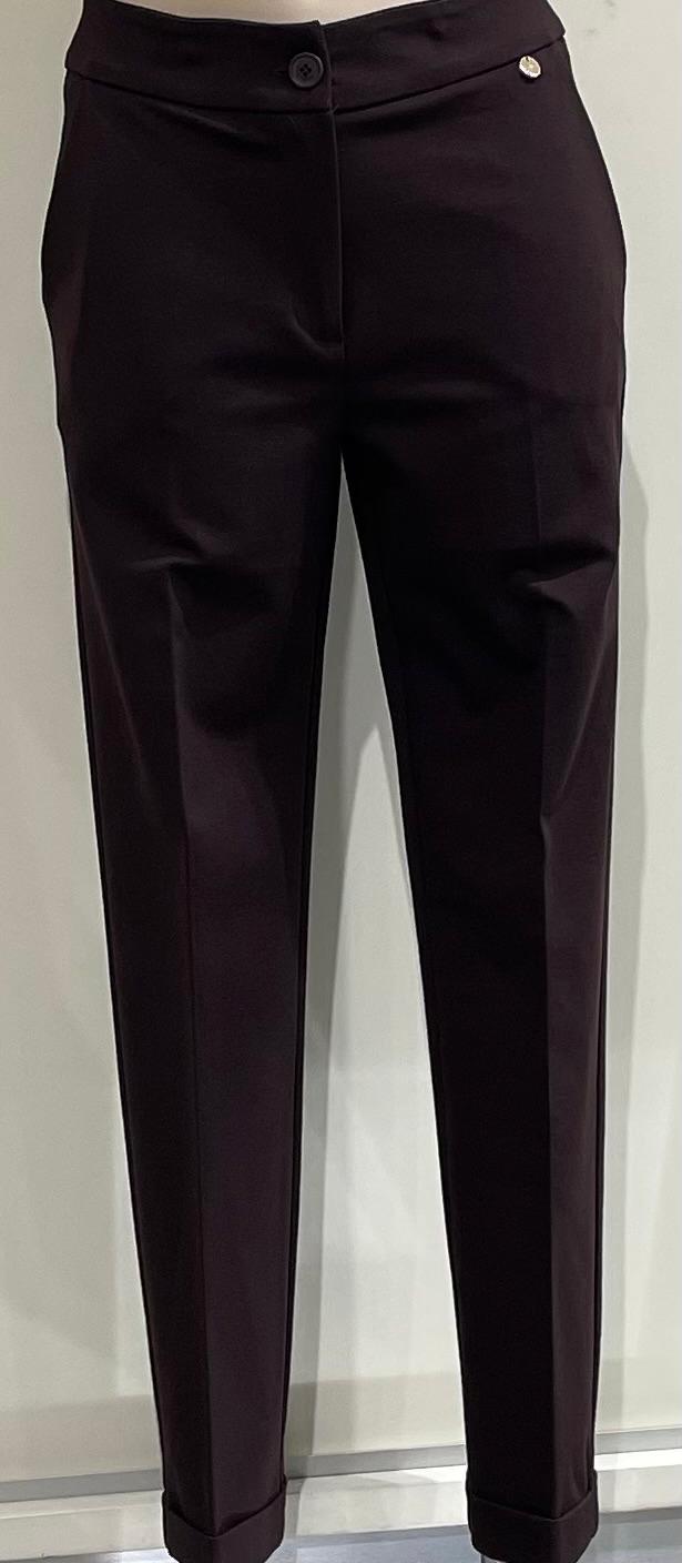 Pantalone donna, apertura con zip, tasche, gamba a sigaretta con risvolto, tinta unita, tessuto punto Milano, colore: tortora, cioccolato, burro.