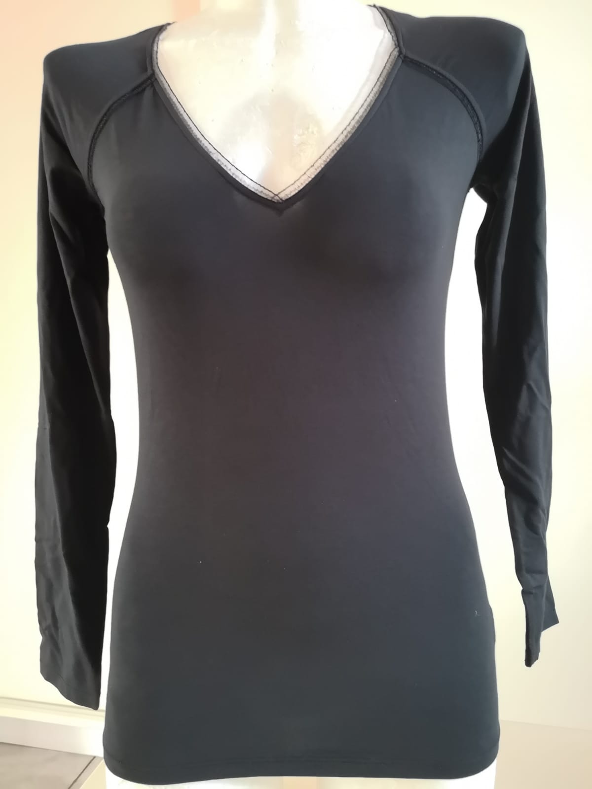 Maglia intima donna, manica lunga, scollo profondo a V, stampa logo retro, tinta unita, colore nero.