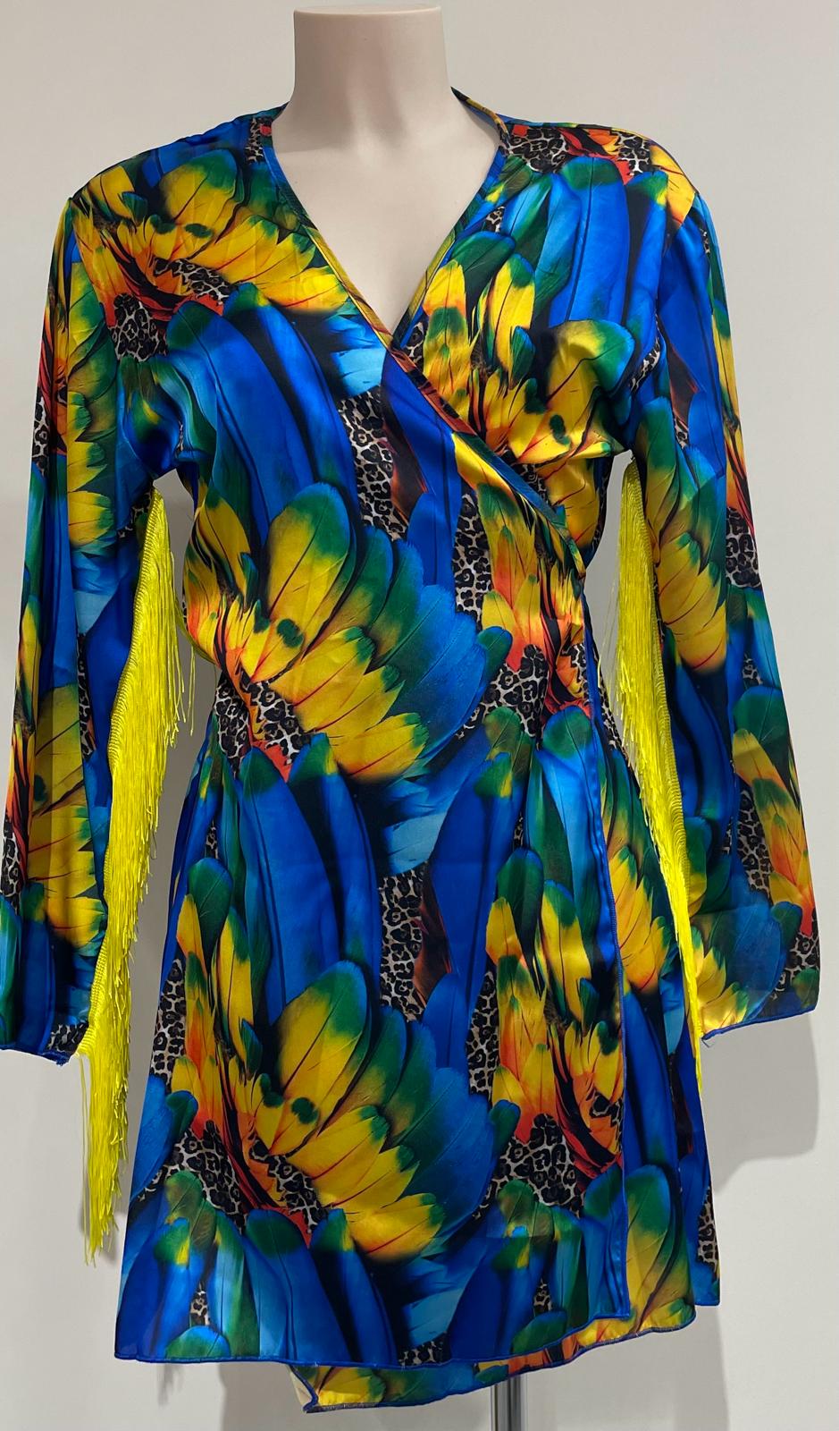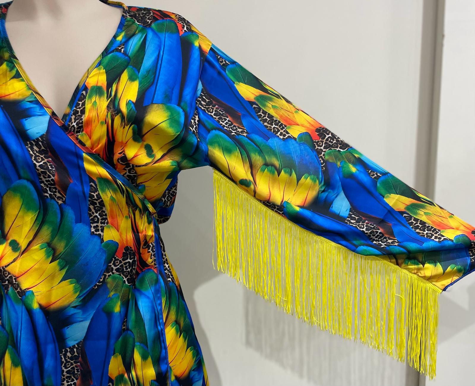 Copricostume modello kimono, con frangia, fantasia, colore piume. Pochette con cerniera, in neoprene, in omaggio.